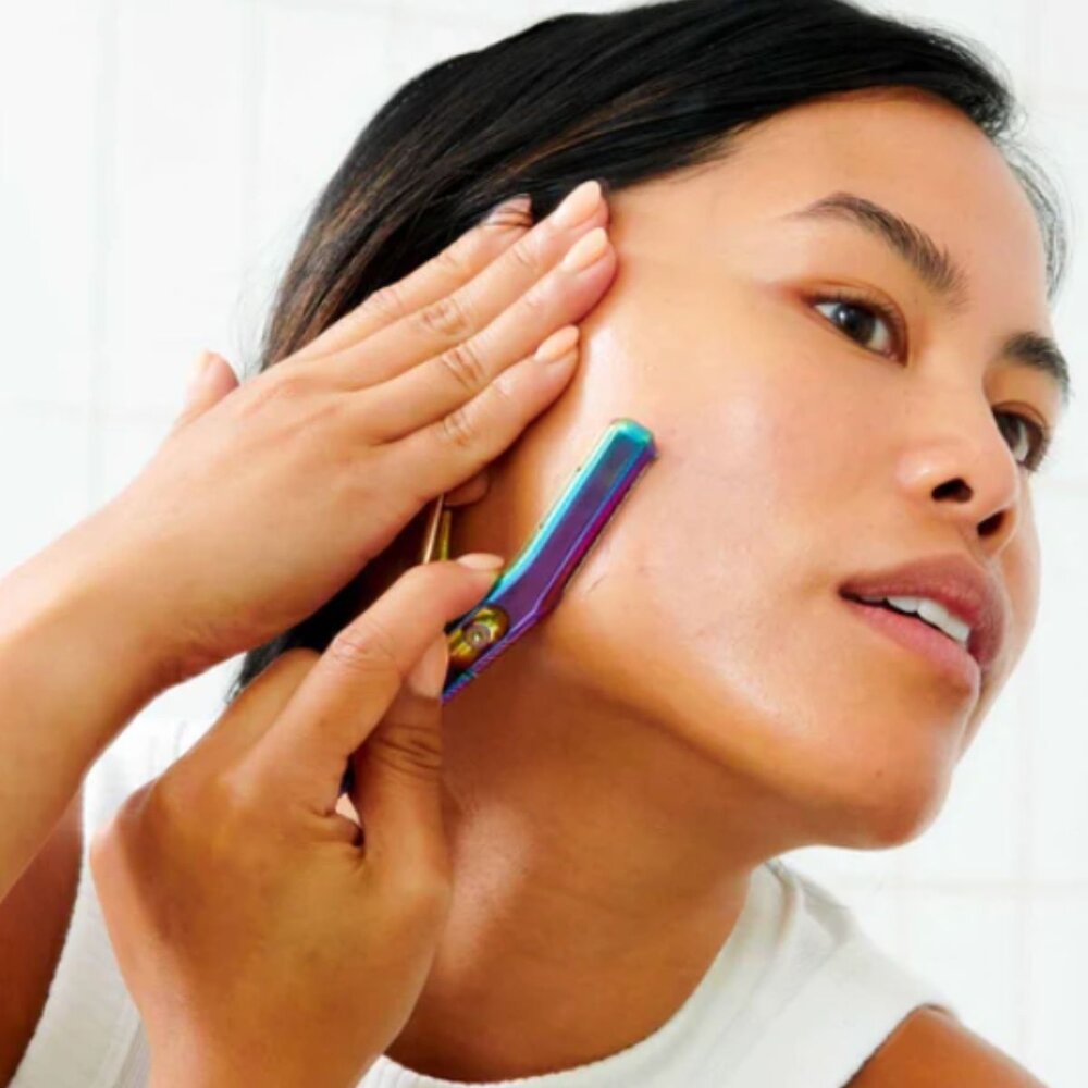 On the other hand, at-home dermaplaning is less expensive, less intense, and growing in popularity. It provides similar benefits while employing tools that anyone can safely use at home. Traditionally, at-home dermaplaning tools are comprised of a steel blade with wire or scalloped guards welded to it, providing a barrier between the skin and the bare blade. This blade protection is what makes dermaplaning at-home safe.