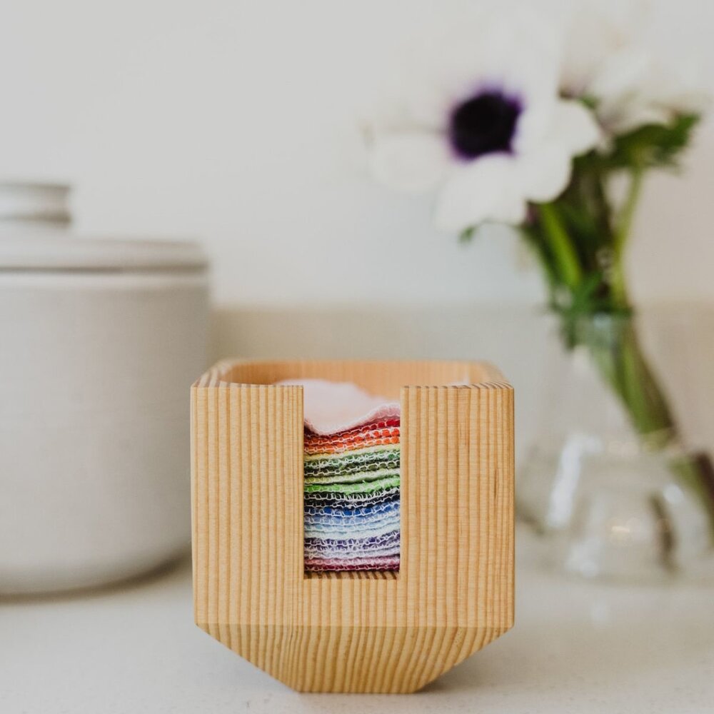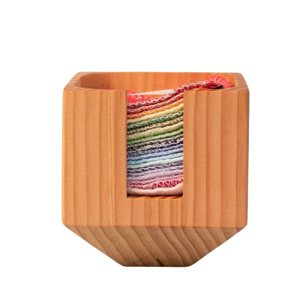 This Wood Container is specifically designed to store Marley's Monsters reusable Facial Rounds. Featuring a geometric design with a finger slot in the front for pulling out Facial Rounds.