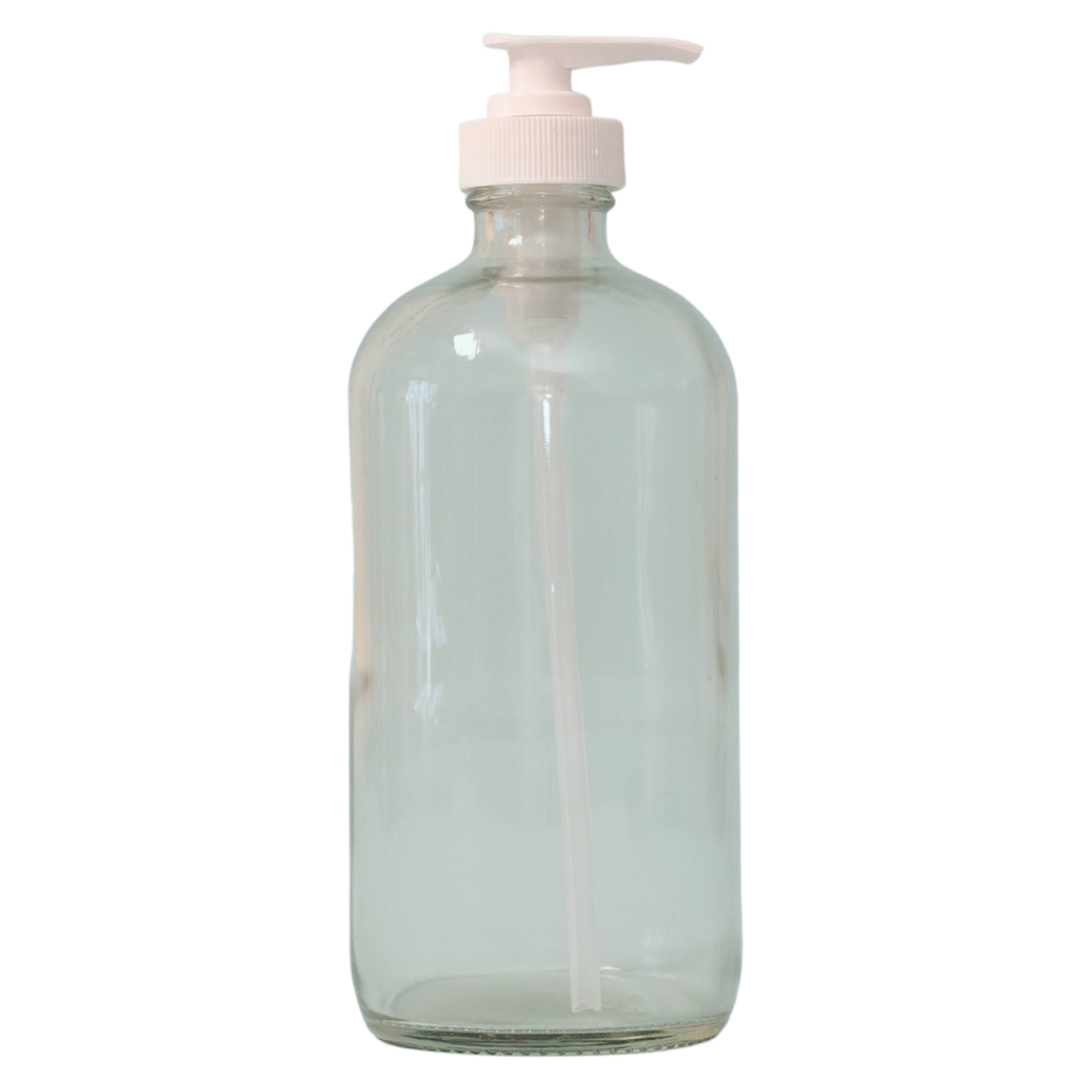 Glass bottle with a plastic BPA-free pump dispenser lid and metal spring