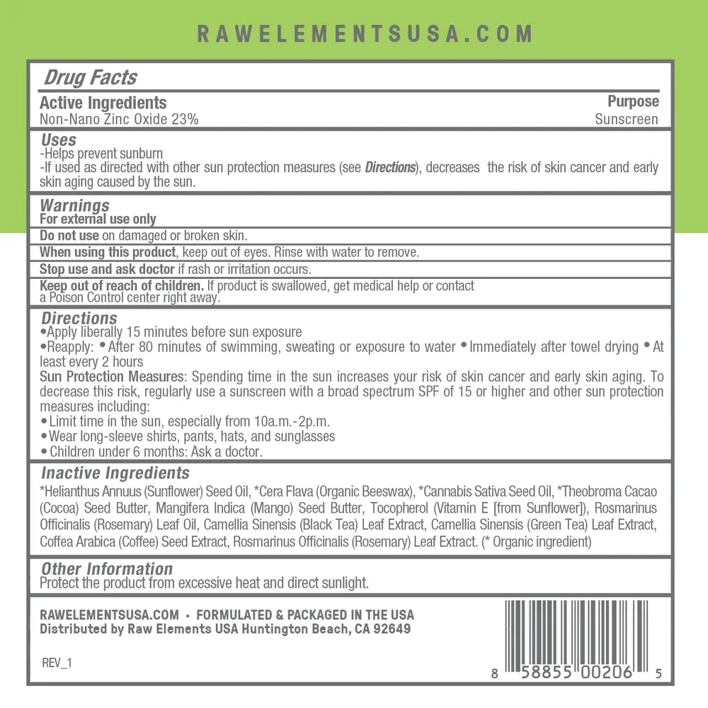Non nano zinc oxide (23%); sunflower oil, green tea, black tea, coffee bean, hemp seed oil, cocoa butter, mango butter, beeswax, rosemary oil extract, vitamin e. Packaged in an aluminum tin.